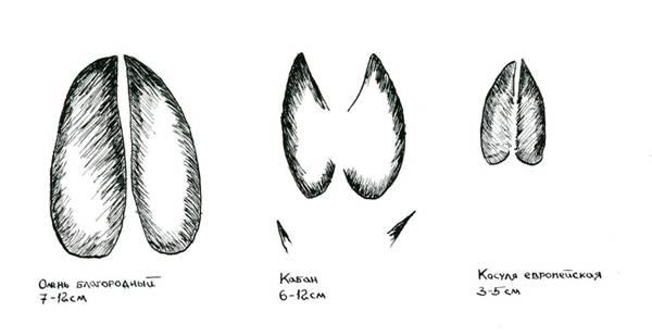 След кабана от других копытных отличается наличием отпечатков боковых пальцев (см. рис.). Интересно, что у самцов след более широк и притуплен.