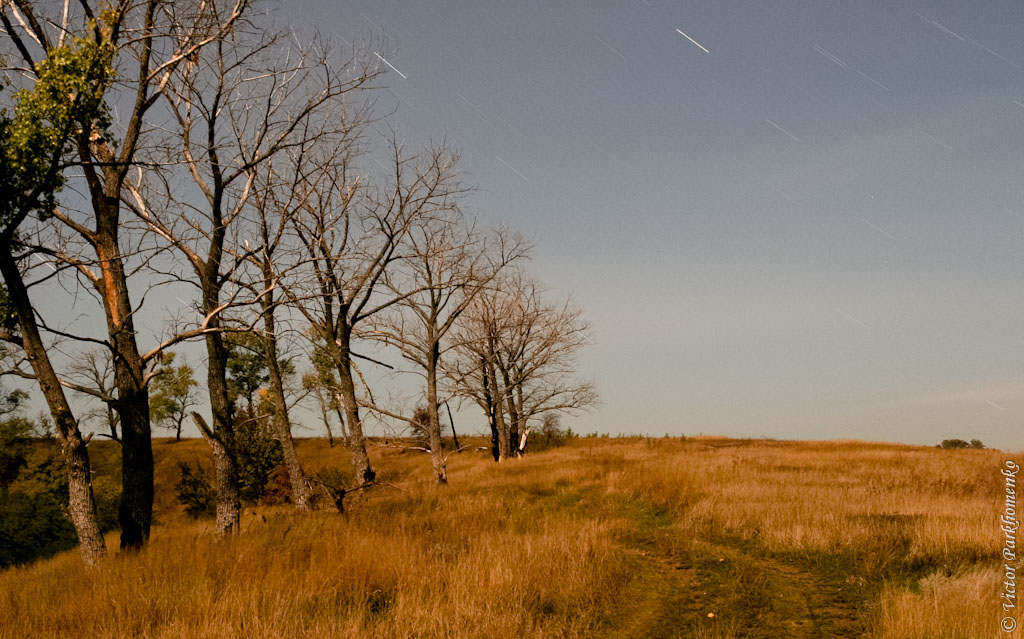 Что непривычно в ночных фото? Из-за вращения земли, звёзды превращаются в тонкие полоски – и чем длительней выдержка фото, тем «длиннее» полосы от звёзд. Если дует ветер – то ветки деревьев становятся размытыми. Из-за движения также нечёткие и облака. Такие вот дела …