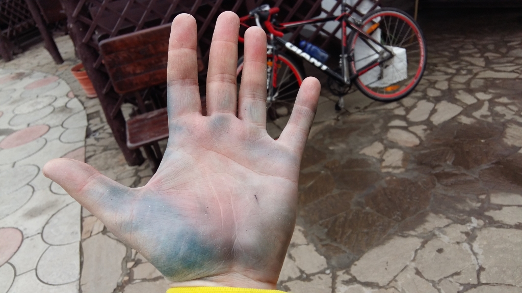 12:40 – Ахтырка, КП-2 в кафе «Подкова» (133 км). Средняя скорость – 23,5 км/ч. Там уже обедал Владимир «Высотник» Пугач. Он успел заехать на речку, чтобы немного отчиститься от грязи дорог. Я же приехал как шахтёр. Лицо отмыть удалось, а вот руки от спортзальных перчаток полностью посинели. Зато обед был шикарный. Суп с фрикадельками, затем котлеты, узвар. Знающие люди заказали стопку самой дешевой водки. Для согрева. Но не внутреннего, а внешнего. Чтобы ноги растереть. А я надел третьи сменные носки и выехал на трассу первым.