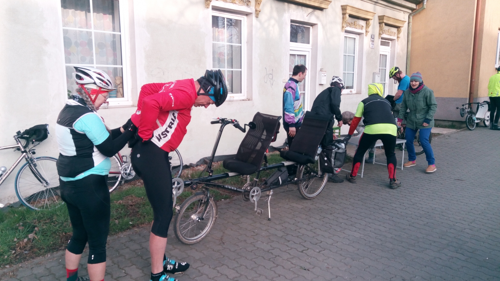 Оказывается место старта располагалось рядом с домом где проживали организаторы сего действа. Как выяснилось позже в Чехии всего один рандонерский клуб , который существует официально с 2015 года. Так вот, спустя немного времени на старте нарисовались и остальные марафонцы, среди которых оказалась пожилая парочка австрийцев, всего участников было 12 человек, четверо из которых стартовали на лигерадах, один тандем и два одиночных.