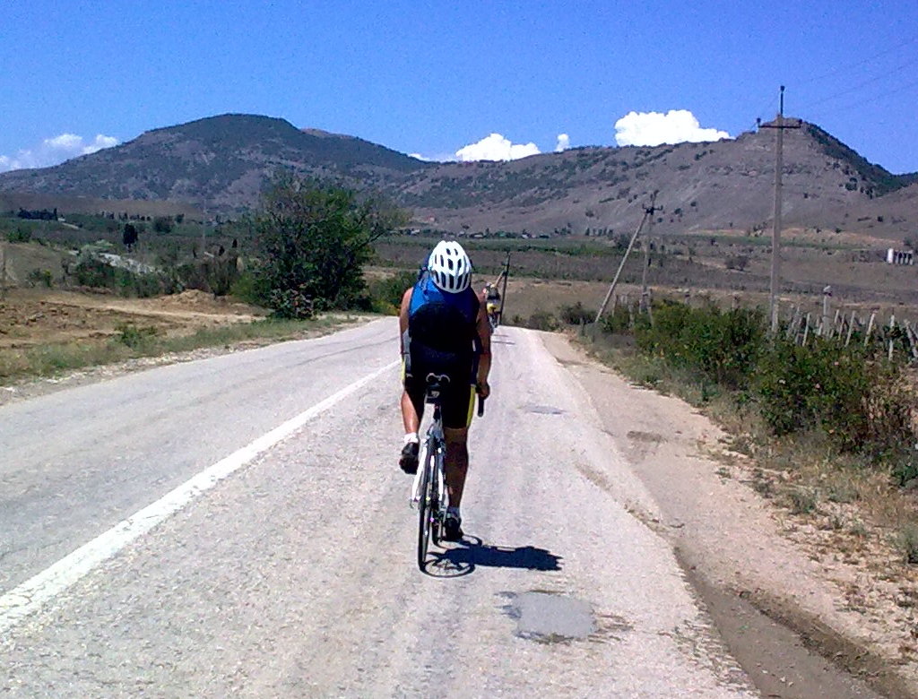 Смотрим - а это шоссейная велогонка идет за нами! Женская к тому же! Бабцы там крутят со страшной силой.