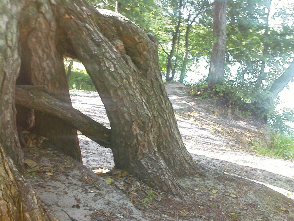 З огляду на піщаний ґрунт лісової дороги, ми вирішили їхати асфальтом, обмеживши знайомство з реліктовим бором оглядом кількох столітніх сосон на березі Ворскли. Від часу частину сипучої землі з-під них було вимито, через що кремезні корені оголилися і створюють враження якоїсь химерної колонади. Кращого місця для колоритного побережжя важко придумати.