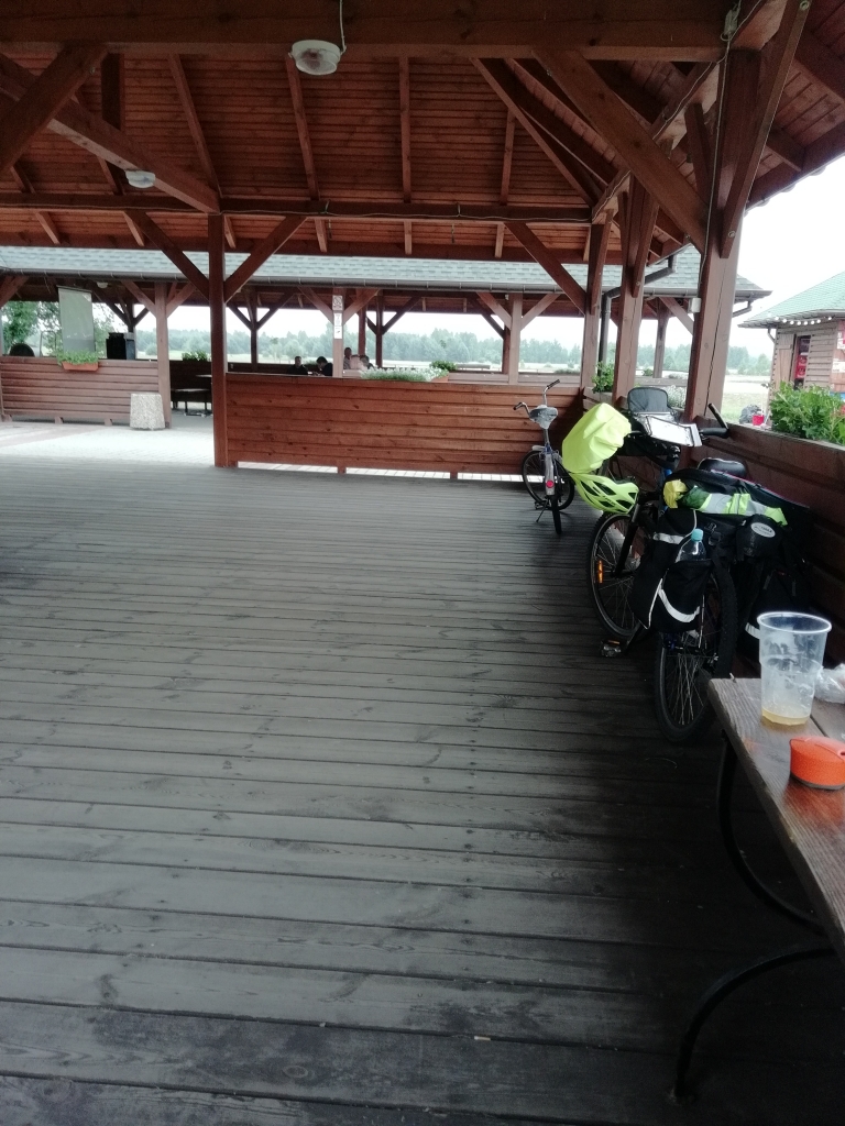 С утра ремонт цепи. Смазка велосипедов. Завтрак и сборы. Часов после 9 выдвигаемся в Звежинец. Попали в пивоварню. Попробовали пива. Заехали в инфоцентр. Надо выдвигаться на Билгорай. И тут на небе становится черным черно. Все затягивает туча. Быстренько чехлимся. Решаем вернутся на кемпинг под навес. Хорошо он по пути. Только успеваем заскочить под навес как нас накрывает дождь. Больше часа сидим под навесом. Хорошо не выехали на дорогу. А то быть нам мокрыми(((. Переждали дождь и выехали практически в 13 часов. Асфальт уже сухой. Спокойно добрались до Билгорая. И дальше по маршруту Грин Вело едем в сторону Ярошина. В одном из поселков, возле магазина решили передохнуть. Выпить молочка. Хозяин магазина нам предложил кофе и чай. Причем все совсем бесплатно. Было очень приятно. Подкрепили и понеслись дальше. В Ярошин приехали ближе к 18. Заскочили в магазин. На глаза попался чеснок. А у меня в сух пайке есть украинский борщ от фирмы Харчи. Прикупили еще сальца ( он бочек называется). У людей попросили укропчика. Приехали на МОР. А он совсем маленький. Но рядом озеро. А там бар. Посетителей нет. Есть хозяин. Мы спросили где можно встать палаткой. Нам сказали- везде)). Ну я напросилась в павильон для не курящих. Под крышу. Нам разрешили. Мы поставили палатку. Приготовили борщик. Купили в баре пива. Вечер удался)))) В начале 11 ночи хозяин уехал. Мы попросили что бы он не закрывал один туалет. Во общем все условия.