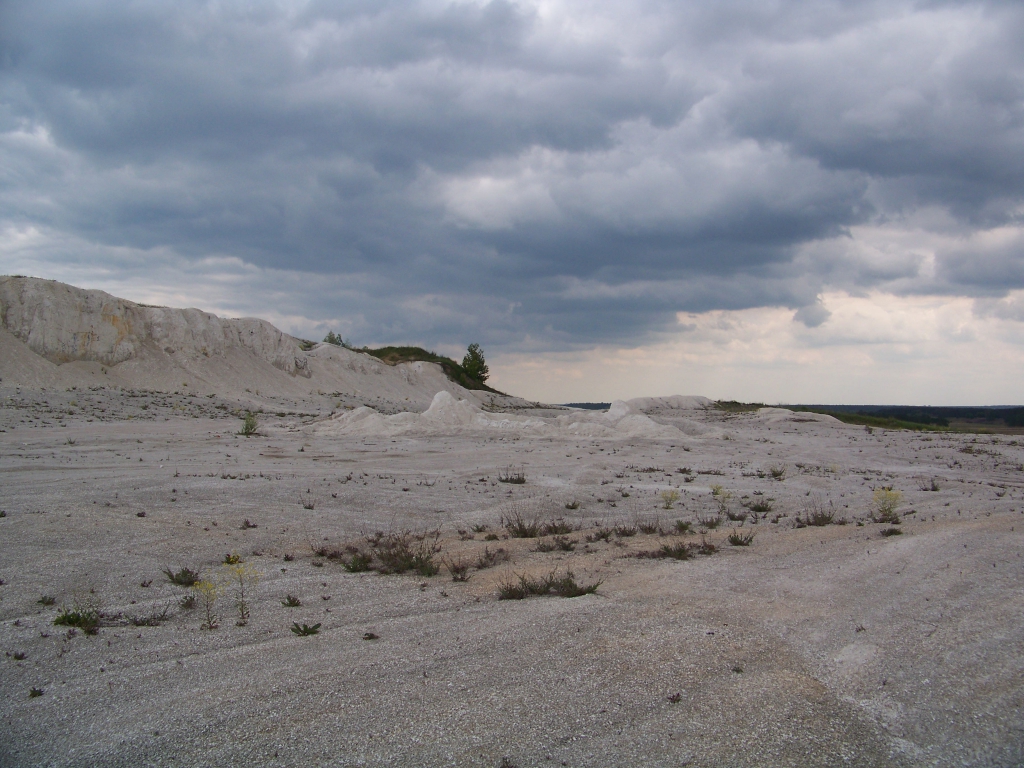Когда въехали на территорию карьера, даже сил добавилось, захотелось по кучам мела покататься - они плотные, не осыпаются. Ожидал, что там белым бело всё будет, но на самом деле мел серый и не очень-то похож на мел, которым привыкли рисовать. Только в надколотой стене нашли реально белые куски. Наверно, дождь и все дела, сереет мел.