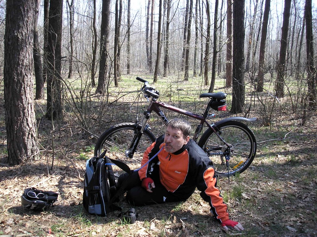 Назрела необходимость сделать одно важное дело. Тут со всей очевидностью вскрылась моя ошибка – купил я себе велошорты с памперсом и с лямками в глухом исполнении. Пришлось полностью раздеваться до пояса. В лесу еще ничего, а если на трассе где-нибудь… Придется апгрейд делать.