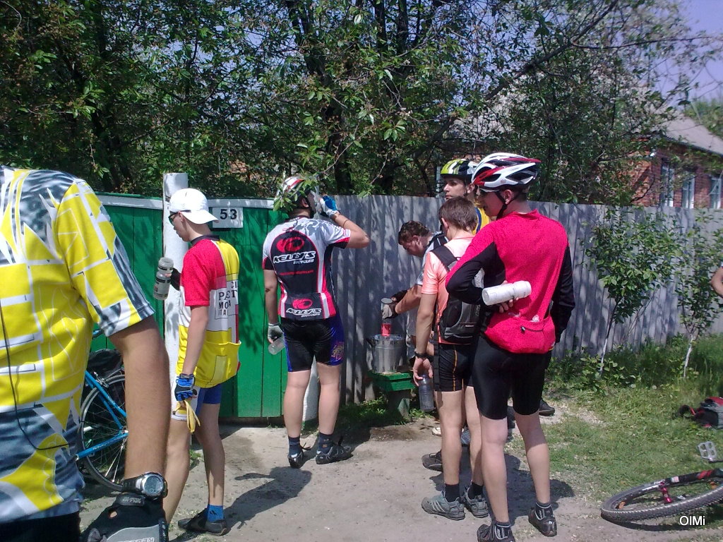 В Лебедині порвався ланцюг. Поки хлопці чекали і поглинали пиво, залатав ланцюг. Пропустили багато людей вперед. Тільки рушили з місця як у AlexN10 прокол. :( Він залишився бортуватись, а ми з OlMi, впевнившись що нашої допомоги не потребується, потроху рушили до Будилки. Там нас чекала група Abadonn'и. Домовились, що поїдемо не поспішаючи але Dino прорвало і до Чупаховки їхали 28-35. Там скучкувалося велика кількість райдерів на водопій.