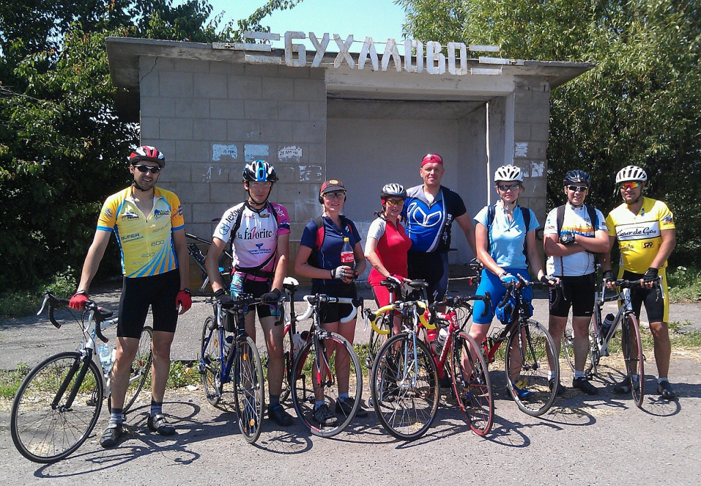 В Комышах (если не путаю) поприветствовал компанию, заправился водой и двинул дальше. После десяти начало припекать. Вот и Бухалово. Спасибо Володе Высотнику за традиционную фотку на остановке. После 12 солнышко включилось на полную, но воздух еще не прогрелся, и до Липовой долины катилось нормально. В Липовой долине довольно интересная такая градостроительная концепция реализована, не ожидал увидеть, равно как и выложить пятнадцать гривен за полтора литра воды, это мой новый антирекорд). Потихоньку докрутил до КП2. Там уже шел пир горой, но свободные места еще были). Отметился, сполоснулся, перекусил. Все класс.