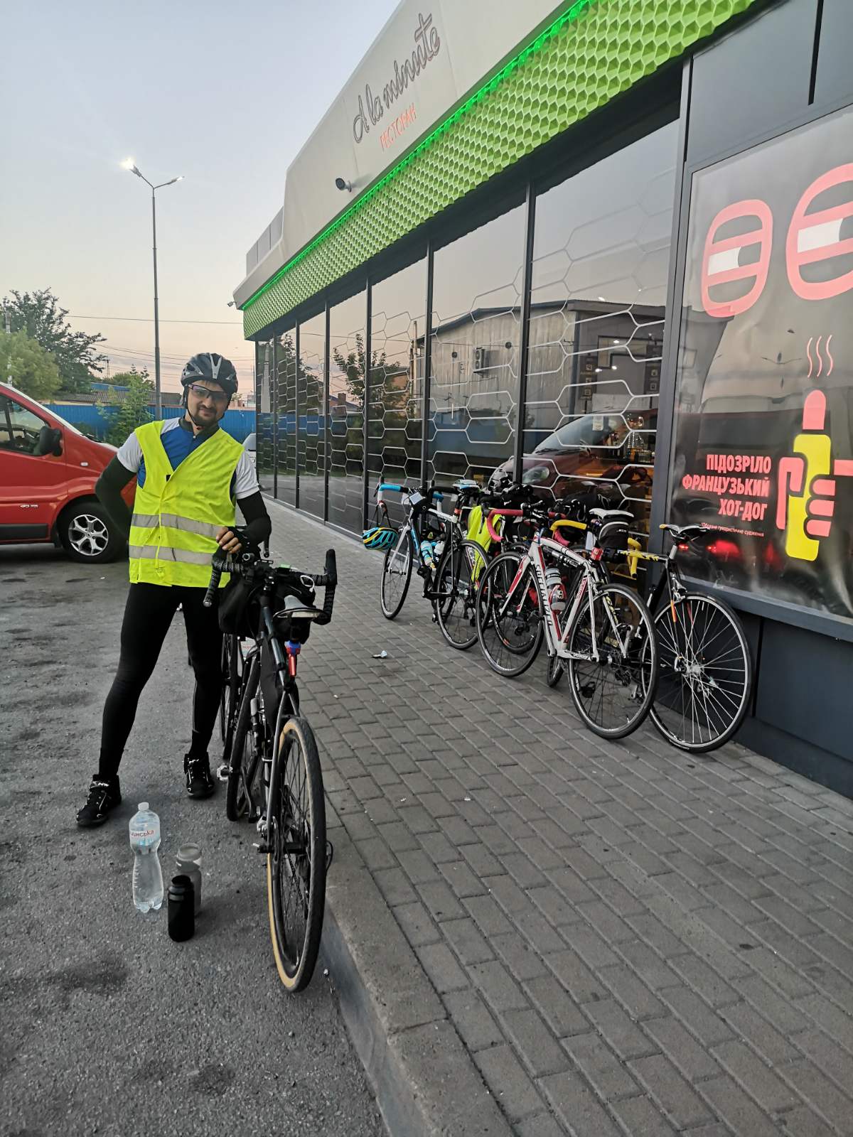 Сон пролетает за секунду и в 2 часа выезжаю с Андрюхой. В принципе мне 4 часа хватило, состояние было хорошее. По ночной трассе ехать одно удовольствие, широкая обочина, минимум трафика и прохладный воздух. Так мы доехали до Пирятина и заправки Окко. Я купил воду, выпил кофе со сникерсом и выехал не много вперед. Через время меня все догнали и уже группой мы поехали в сторону КП, где нас ждал завтрак.