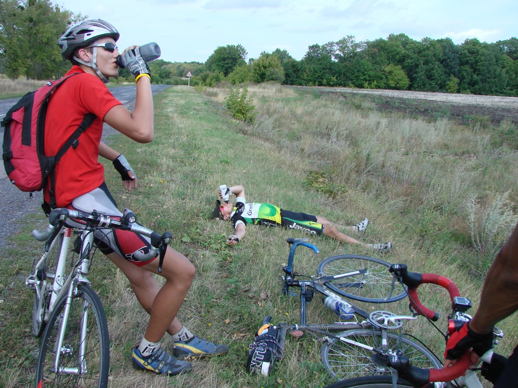 После Лебедина и одноименного района пошел сумской район с аналогичным асфальтом….кручу, кручу, кручу, остался один(кто обогнал, а кто и отстал)…кончилась вода, а солнце палит, а магазов нет…вижу кто-то из наших заканчивает поклейку камеры…мне по-братски отливают половину воды(ДАЙ БОГ ЗДОРОВЬЯ!!!)…кручу стоя, сильно трясет…выезд на Сумы…нормальный асфальт…холодный Живчик…кручу на расслабоне до финиша….