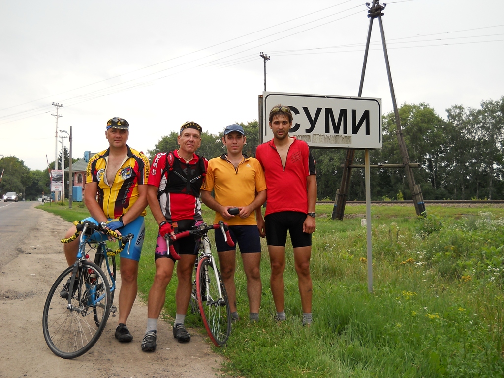В Белополье попили водички. Ну а дальше задорно покрутили домой. Погода отличная была, мелкий дождик только помогал. И вот уже спуск к Сумам..Фото на память на финише.