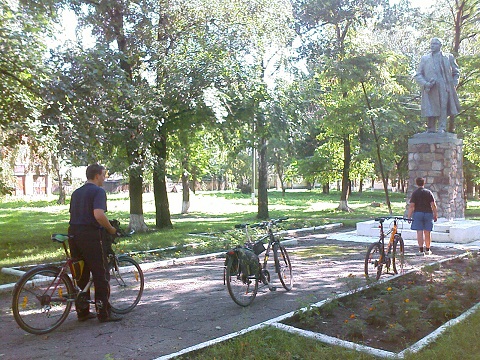 Уточнивши напрямок, ми знову осідлали велосипеди, але зробили поворот раніше, ніж сподівалися, і не направо, а наліво. Річ у тому, що майже одразу після автобусної зупинки в тіні скверу ми запримітили пам’ятник вождю світового пролетаріату, яких не так вже багато полишалося. Тож, скориставшись моментом, зробили чергову фотосесію. До речі, поруч на невеликому земляному насипі було встановлено великий дерев’яний хрест. Схоже, раніше на місці монумента Леніну стояла дещо інша архітектурна пам’ятка. І не виключено, що хрест – це лише як повістка про те, що кандидатуру на окрасу села було переглянуто і незабаром на місці скульптурної композиції постане якась церква, а дядечко з кашкетом у руці лишиться тільки на наших фото.