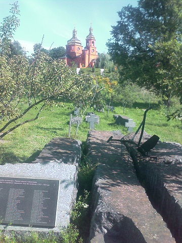 Поки хлопці дообідували, я трохи походив по скверику і позад храму знайшов кам’яну брилу з табличкою, яка сповіщала, що будівництво святині було освячено 27 квітня 2008 року за участю тодішнього Президента України В.А. Ющенка. Схоже, внутрішні роботи ще тривають, але зовні Свято-Миколаївський храм виглядає майже завершеним. Також у скверику я надибав купу інших пам’яток, серед яких особливо резонно виглядає встановлена майже під стінами храму стела борцям за радянську владу. А однією з найостанніших пам’яток є, певно, Чорнобильська капличка, встановлена край дороги.