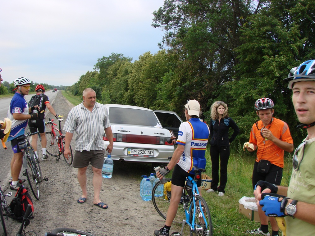 Земляки как-то рванули вперед, а я по-тихоньку, то рядом, то позади, то впереди ехал с нашим гостеприимным хозяином OlMi (Олегом)…так мы дошли до первого КП в Ахтырке (где-то 75 км) где уже стояли Илья с Сергеем, Витю я уже не наблюдал (мне сказали что он поехал с «передовиками») перекусив бананами и отдав «Сникерс» Илье я двинул дальше, почитывая мануал на телефоне дабы не заплутать как на 200-ке в Ахтырке. Потихоньку сформировалась группа во главе с OlMi, которая, героически борясь, со встречным ветром докатилась до Гадяча (где-то 150 км) - середине нашего бревета, где и устроили маленький пит-стоп возле гастрономчика.
